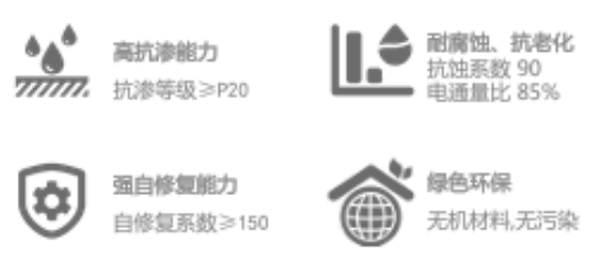 減少結(jié)構(gòu)開裂 提高抗?jié)B能力 修復(fù)細(xì)微裂縫抑制水化溫升 抵御腐蝕介質(zhì) 延長建筑壽命執(zhí)行標(biāo)準(zhǔn):T/CECS 10226-2022、GB 18445-2012 、JC/T 474-2019